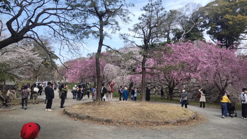 多聞櫓の入り口付近には、しだれ桜がいくつか。ここだけソメイヨシノとは違う濃いピンク。