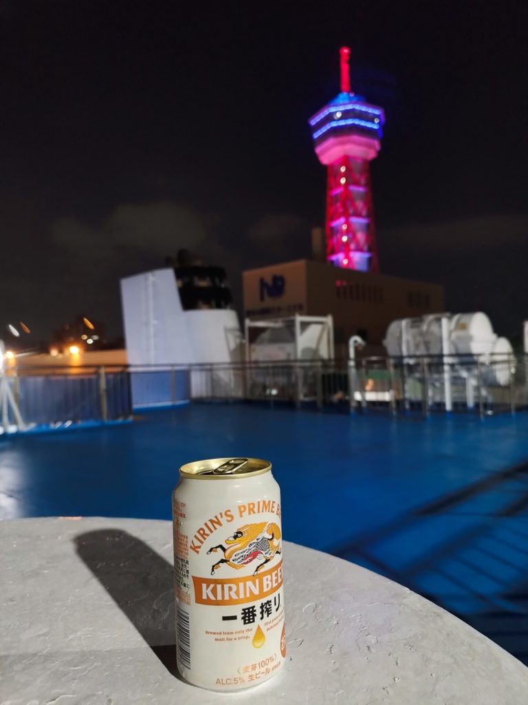 乗り込んで荷物を置いて、甲板に出て、プシューっと一杯やります。